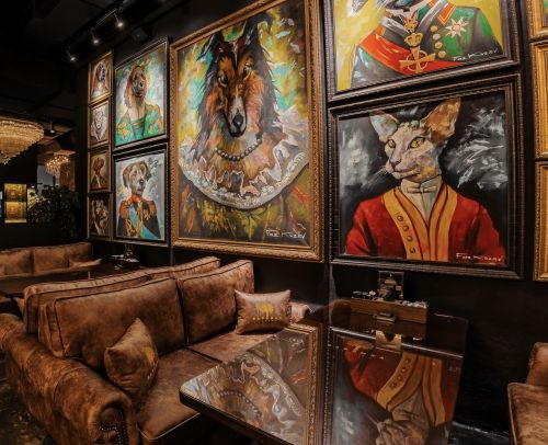 Интерьер второго зала отличается не только мебелью. Выбрав его для своего отдыха, вы окажетесь в картинной галерее. Известный московский художник специально для кальянной на Бауманской создал более 30 шедевров.